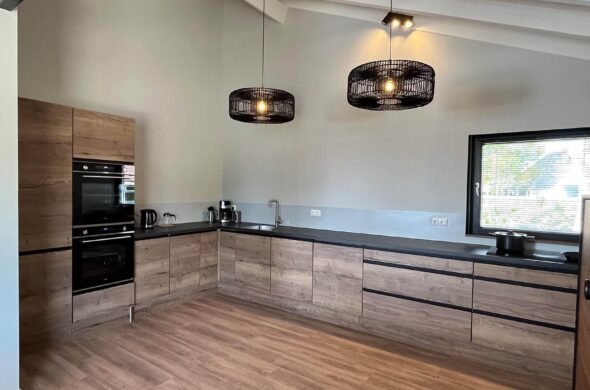 De woonkeuken biedt voldoende ruimte voor het hele gezelschap. Bij de eettafel staan negen losse stoelen en een ruime zitbank. In het woongedeelte staat een ruime hoekbank en twee fauteuils. Ook is er een tv aanwezig. De keuken is uitgerust met een 6-pits inductiekookplaat, 2 koelkasten met vriesvak, 2 combi-ovens, 2 afwasmachines, een koffiezetapparaat en waterkoker. Verder is er een uitgebreid assortiment aan keukenmateriaal aanwezig. (Glazen, bestek, borden, schalen, pannen etc.)