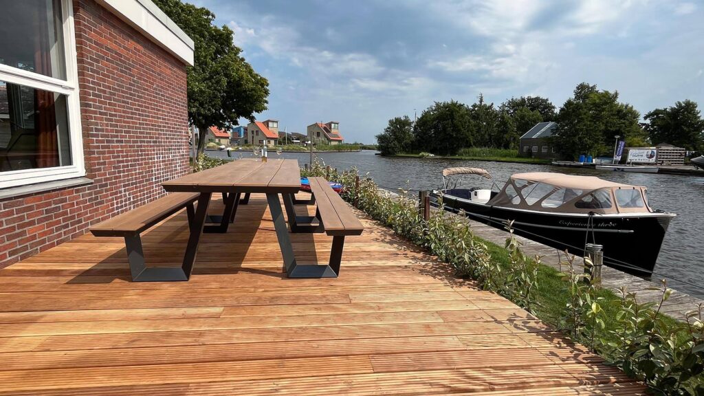Het ruime terras is voorzien van voldoende zitplaatsen voor iedereen. Zo is er een picknicktafel en een tafel met stoelen.